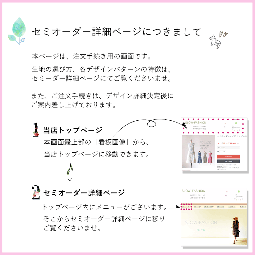本画面の最上部にある看板画像から当店トップページに移動し、そこからセミオーダー詳細ページをご覧くださいませ。