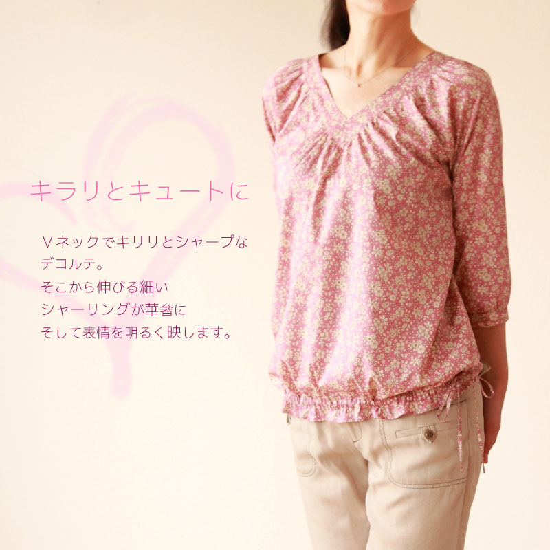 リバティ マーガレット・アニー仕立て シャーリングVネック 裾リボン チュニック